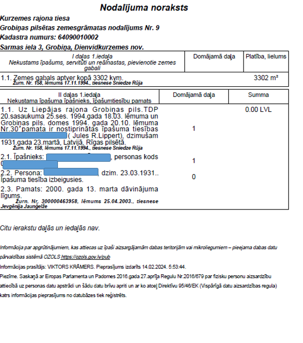 Land registry of the restituted property in Grobina City from 1994 - Latvian language